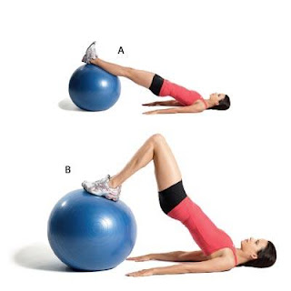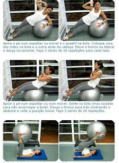 Apóie o pé num espaldar ou num móvel. Sente na bola (mas cuidado para não escorregar a bola). Desça o tronco para trás contraindo o abdome e volte a posição inicial. Faça 3 séries de 20 repetições.
