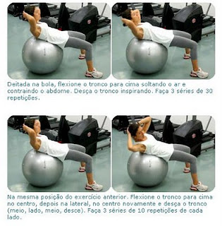Deitada na bola, flexione o tronco para cima soltando o ar e contraindo o abdome. Desça o tronco inspirando. Faça 3 séries de 30 repetições.